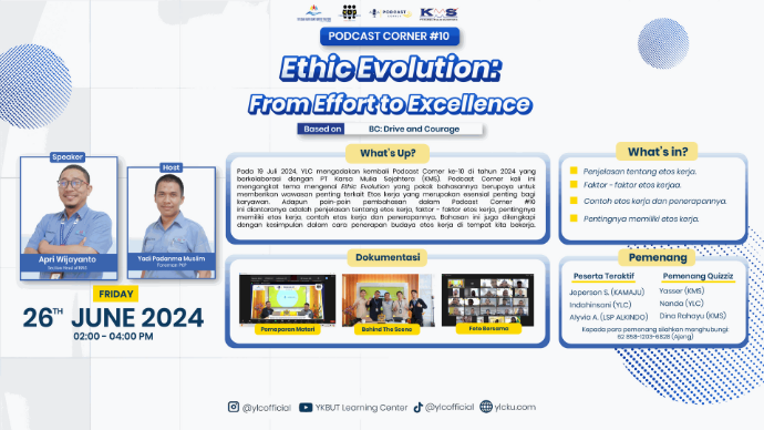 Podcast Corner #10 disampaikan oleh narasumber dari Karsa Mulia Sejahtera,Apri Wijayanto, yang didampingi oleh Yadi Padanma Muslim sebagai host. Narasumber dan host memberikan pemaparan yang interaktif dan berbobot, menjadikan suasana podcast tetap menarik dan informatif. Bagi para pendengar yang terdiri dari karyawan entitas YKBUT dan eksternal, topik ini menjadi relevan karena etos kerja merupakan kunci utama untuk meraih kesejahteraan dan produktivitas di tempat kerja.