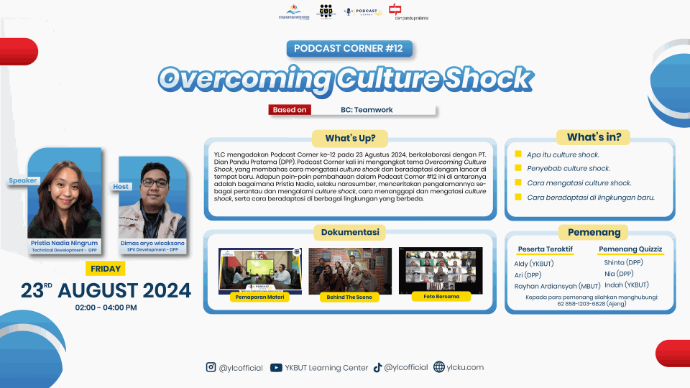 Podcast Corner #12 disampaikan oleh narasumber dari Karsa Mulia Sejahtera, Pristia Nadia Ningrum, yang didampingi oleh Dimas Aryo Wicaksono sebagai host. Narasumber dan host memberikan pemaparan yang interaktif dan berbobot, menjadikan suasana podcast tetap menarik dan informatif. Bagi para pendengar yang terdiri dari karyawan entitas YKBUT dan eksternal, topik ini menjadi relevan karena pemahaman mengenai culture shock merupakan salah satu aspek yang sangat berpengaruh dan penting bagi karyawan dalam berperilaku di dalam sebuah perusahaan maupun kehidupan sehari-hari.