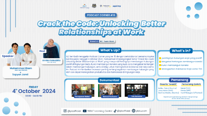 Jumat, 4 Oktober 2024 - Podcast kali ini mengangkat tema "Crack the Code: Unlocking Better Relationships at Work" yang menyoroti pentingnya membangun hubungan yang lebih baik di tempat kerja. Beberapa poin utama yang dibahas meliputi pentingnya hubungan positif di lingkungan kerja, kunci membangun koneksi yang kuat, cara mengatasi tantangan dalam membangun hubungan, serta strategi untuk meningkatkan kolaborasi dan kerja sama tim. Podcast ini memberikan wawasan penting tentang bagaimana membangun hubungan yang lebih baik dapat meningkatkan produktivitas dan harmonisasi di lingkungan kerja. Podcast Corner diadakan secara hybrid dan memperoleh lebih dari 30 partisipan yang ikut meramaikan podcast ini.