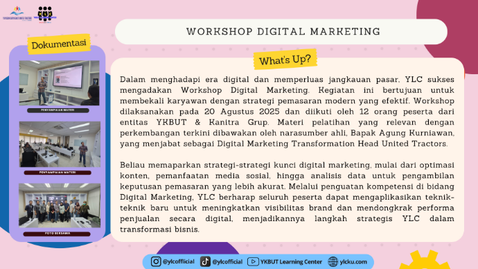 Dalam menghadapi era digital dan memperluas jangkauan pasar, YLC sukses mengadakan Workshop Digital Marketing. Kegiatan ini bertujuan untuk membekali karyawan dengan strategi pemasaran modern yang efektif. Workshop dilaksanakan pada 20 Agustus 2025 dan diikuti oleh 12 orang peserta dari entitas YKBUT & Kanitra Grup.