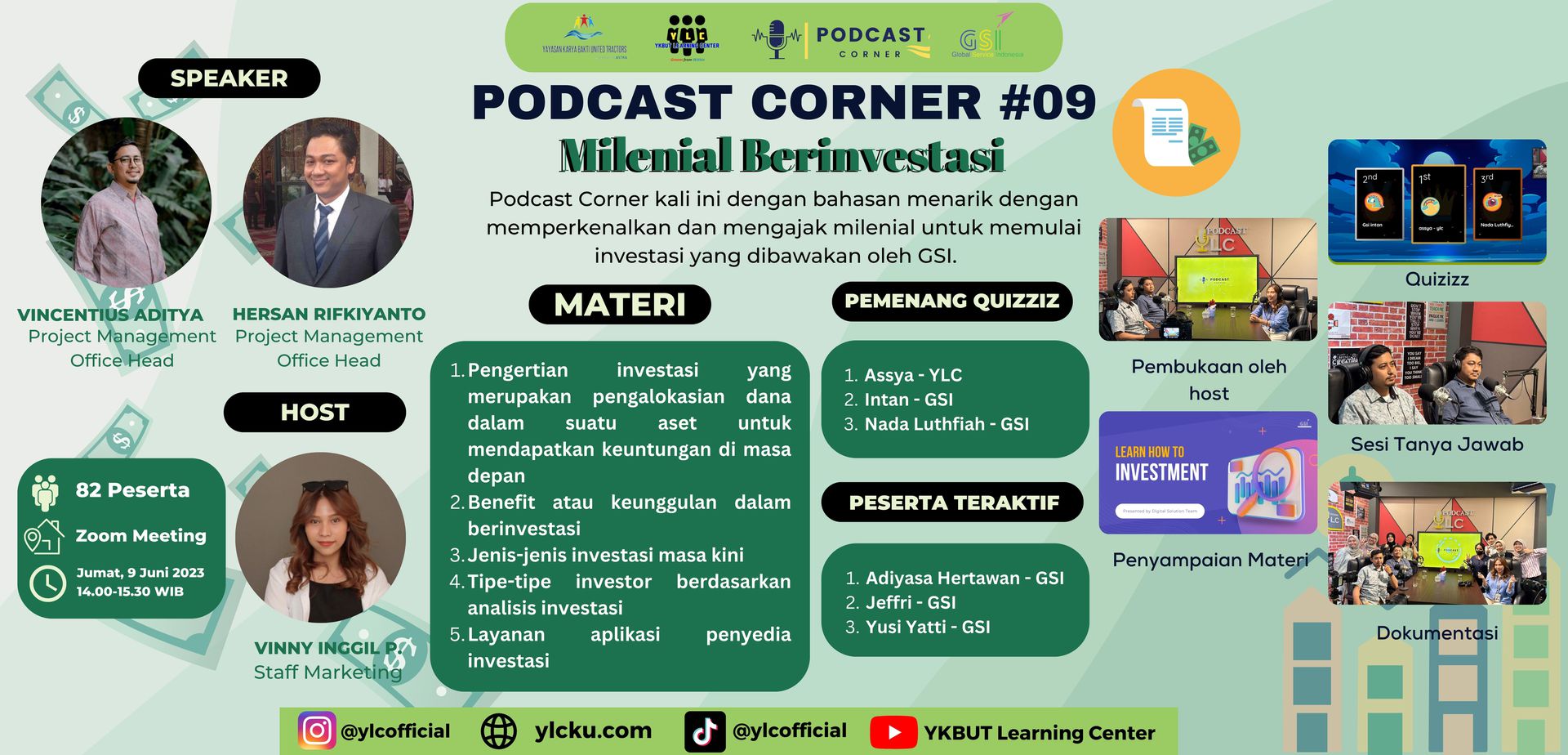 Pada Hari Jumat (9/07/2023), YLC berkolaborasi dengan GSI dalam acara Podcast Corner #09 dengan tema menarik untuk dibahas yaitu "Milenial Berinvestasi" yang dibawakan oleh Narasumber kita (Vincentius Aditya dan Hersan Rifkiyanto) dengan dipandu oleh Host kita kali ini (Vinny Inggil).
